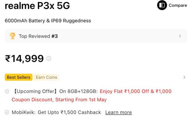 realme P3x 5G ফোনের 6GB RAM ভেরিয়েন্টে ফ্ল্যাট 1,000 টাকার ডিসকাউন্ট এবং 1,000 টাকার ব্যাঙ্ক কার্ড অফার দেওয়া হবে। একইভাবে কোম্পানির পক্ষ থেকে ফোনের 8GB RAM ভেরিয়েন্টে 1,000 টাকার ফ্ল্যাট ডিসকাউন্ট এবং 1,000 টাকার কুপন ডিসকাউন্ট পাওয়া যাবে। অর্থাৎ উভয় ভেরিয়েন্ট 2 হাজার টাকা সস্তায় কেনা যাবে।