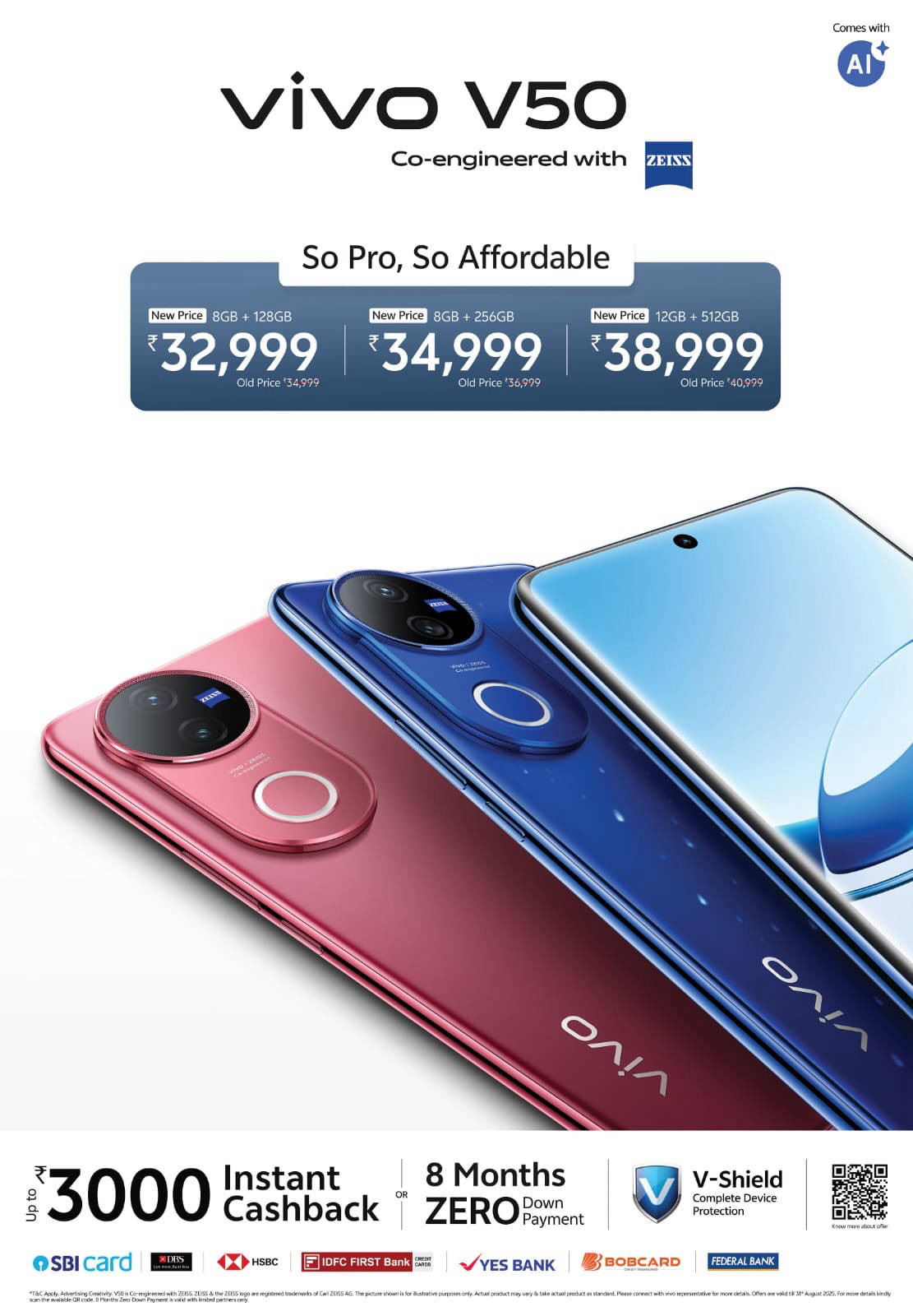কোম্পানির পক্ষ থেকে Vivo V50 5G ফোনটিতে 2 হাজার টাকার প্রাইস ড্রপ জারি করা হয়েছে। ভিভোর পক্ষ থেকে ফোনের সমস্ত ভেরিয়েন্টে দাম কমানো হয়েছে, এরপর ফোনের দাম 32,999 টাকা থেকে শুরু। অন্যদিকে 8GB RAM+256GB ভেরিয়েন্টের দাম 36,999 টাকা এবং 12GB RAM++512GB স্টোরেজ ভেরিয়েন্টের দাম 38,999 টাকা হবে।
