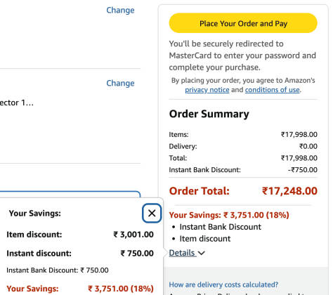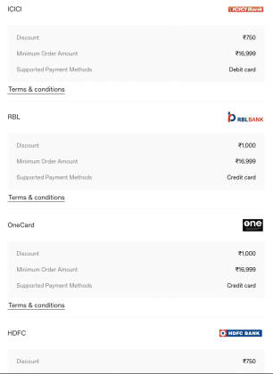 - কোম্পানির ওয়েবসাইটের মাধ্যমে RBL এবং OneCard ক্রেডিট কার্ডে 1,000 টাকার ছাড় পাওয়া যাবে এবং এই দুটি ক্রেডিট কার্ডের পাশাপাশি আমাজনের মাধ্যমে Federal Bank এবং BOBCARD ক্রেডিট কার্ডেও একই ডিসকাউন্ট দেওয়া হবে।