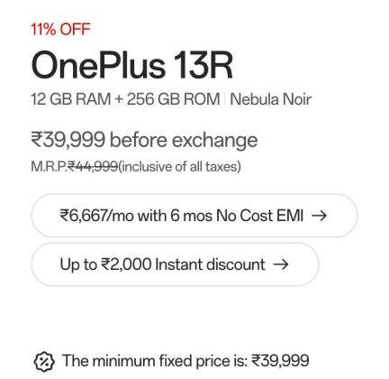 কোম্পানির ওয়েবসাইট এবং শপিং সাইট আমাজনে ডিসকাউন্ট সহ OnePlus 13R ফোনটি পাওয়া যাচ্ছে। এই ফোনের 12GB RAM + 256GB স্টোরেজ অপশনের দাম 42,999 টাকা রাখা হয়েছিল। অন্যদিকে OnePlus 13R ফোনটি 37,999 টাকা দামে সেল করা হচ্ছে। অর্থাৎ ওয়ানপ্লাস ফ্যানরা ফোনটি 5,000 টাকা কম দামে কিনতে পারবেন।
