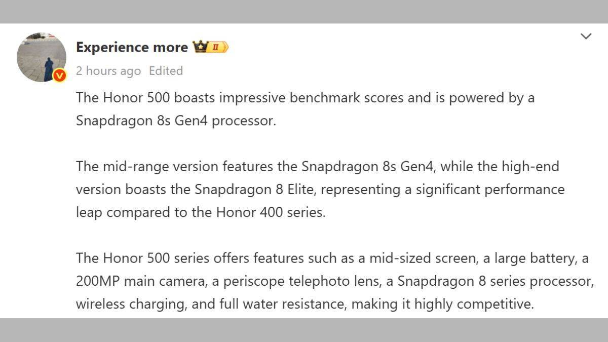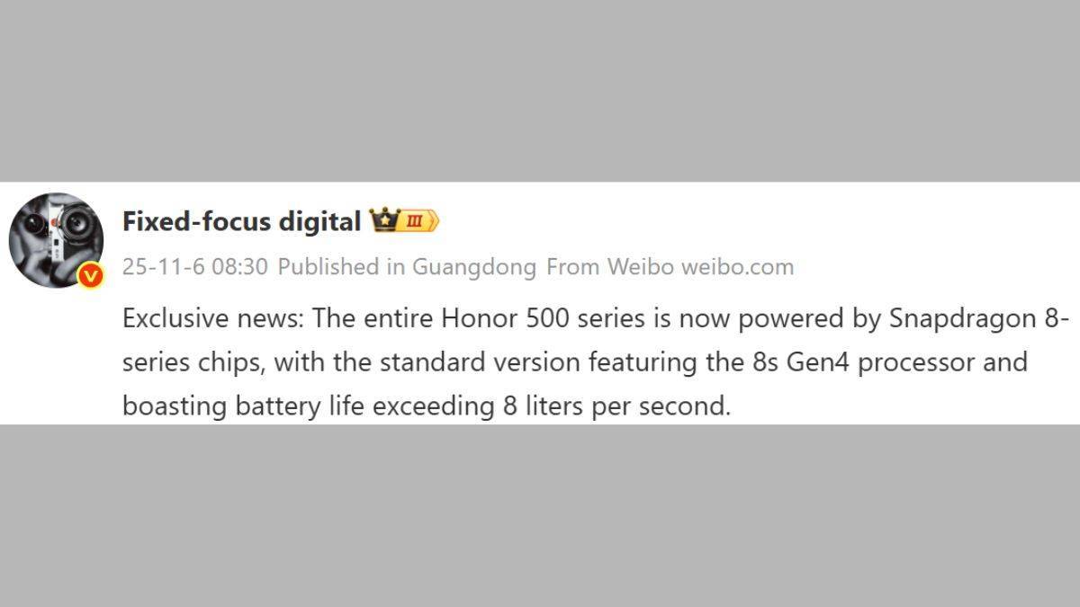 টিপস্টার ফিক্সড ফোকাস ডিজিটাল এবং Honor এর R&D ইঞ্জিনিয়ার A Yong এর বক্তব্য অনুযায়ী আপকামিং Honor 500 সিরিজের সমস্ত মডেল Snapdragon 8 সিরিজের প্রসেসর দেওয়া হতে পারে। সিরিজের ভ্যানিলা Honor 500 মডেলে Snapdragon 8s Gen 4 প্রসেসর থাকতে পারে। অন্যদিকে Honor 500 Pro ফোনটিতে Snapdragon 8 Elite প্রসেসর যোগ করা হতে পারে।