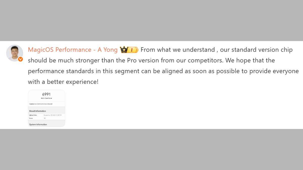 Honor ইঞ্জিনিয়র A Yong আরও জানিয়েছেন, কোম্পানি এবার পারফরমেন্সের নতুন রেকর্ড তৈরি করার লক্ষ্য নিয়ে এগোচ্ছে। তাঁর বক্তব্য অনুযায়ী Honor 500 ফোনটিও অন্যান্য ব্র্যান্ডের Pro ভেরিয়েন্টের চেয়ে বেশি শক্তিশালী হবে।