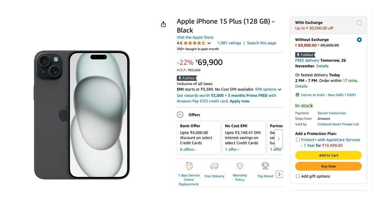 - iPhone 15 Plus ফোনের দাম আপাতত 89,600 টাকা। আমাজনে এই ফোনটি 17% ছাড় সহ সেল করা হচ্ছে। ফলে ফোনটির দাম কমে 68,000 টাকা হয়ে গেছে। এটি iPhone 15 Plus ফোনটির 128GB স্টোরেজ সহ বেস মডেলের দাম।