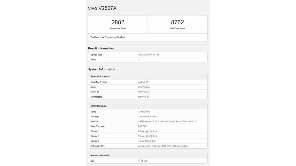 গীকবেঞ্চ লিস্টিং থেকে জানা গেছে এই ফোনে MediaTek Dimensity 9400+ প্রসেসর দেওয়া হবে। জানিয়ে রাখি এটি মিডিয়াটেকের একটি ফ্ল্যাগশিপ প্রসেসর। এর সঙ্গেই ফোনটিতে গ্রাফিক্সের জন্য Mali Immortalis-G925 MC12 GPU যোগ করা হবে। এই ফোনটি গীকবেঞ্চ সিঙ্গেল কোর টেস্টে 2882 পয়েন্ট এবং মাল্টি কোর টেস্টে 8762 স্কোর পেয়েছে। জানিয়ে রাখি ফোনটি লঞ্চের পর বাস্তবিক টেস্টে স্কোরের পার্থক্য দেখা যেতে পারে।
