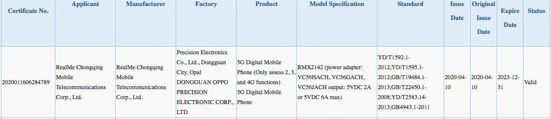MySmartPrice এর রিপোর্ট অনুযায়ী এই Realme ফোনটি RMX2142 মডেল নাম্বারের সঙ্গে চীনের 3C সার্টিফিকেশন সাইটের সঙ্গে সঙ্গে আরেকটি সার্টিফিকেশন সাইট MIIT তে দেখা গেছে। এই দুটি লিস্টিঙেই RMX2142 মডেল নাম্বারযুক্ত স্মার্টফোনে 5জি সাপোর্ট করবে বলে জানানো হয়েছে। আবার 3C এর লিস্টিং থেকে আরও জানা গেছে যে এই ফোনে 30 ওয়াট ফাস্ট চার্জিং সাপোর্ট করবে। তবে সার্টিফিকেশন সাইট MIIT তে এবিষয়ে কোনো উল্লেখ করা হয়নি।
