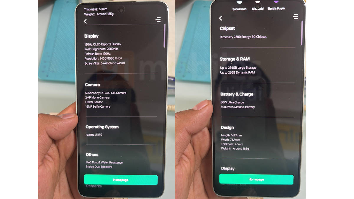 সবচেয়ে বড় বিশেষত্ব হল এই সিরিজের অন্যান্য ফোনের তুলনায় কোম্পানির আপকামিং ফোনের ডিজাইন সম্পূর্ণ আলাদা দেখাচ্ছে। realme 15 5G, 15T এবং 15 Pro ফোনগুলিতে স্কয়ার শেপের ক্যামেরা মডিউল দেওয়া হয়েছিল, এবার নতুন realme 15 Lite ফোনটিতে সার্কুলার শেপের রেয়ার ক্যামেরা সেটআপ থাকবে। আপকামিং ফোনটি অনেকটা সম্প্রতি লঞ্চ হওয়া OPPO F31 Pro+ 5G দেখাচ্ছে, এই ফোনের সম্পূর্ণ ডিটেইলস জানার জন্য এখানে ক্লিক করুন। নতুন রিয়েলমি ফোনটি Satin Green, Glitz Gold এবং Electric Purple কালার অপশনে সেল করা হবে।