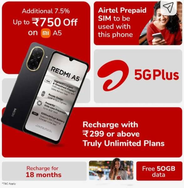 Redmi A5 Airtel এডিশন ফোনটি কিনে এতে এয়ারটেল সিম ব্যাবহার করলে ইউজারদের কোম্পানির পক্ষ থেকে 7.5 শতাংশ ডিসকাউন্ট দেওয়া হবে। এই অফারে ইউজাররা সর্বোচ্চ 750 টাকা ছাড় পাবেন। এছাড়াও ইউজারদের বিনামূল্যে 50GB ইন্টারনেট ডেটা দেওয়া হবে। এই ফোনটি মাত্র 5999 টাকা দামে Jaisalmer Gold, Just Black এবং Pondicherry Blue কালার অপশনে সেল করা হবে।
