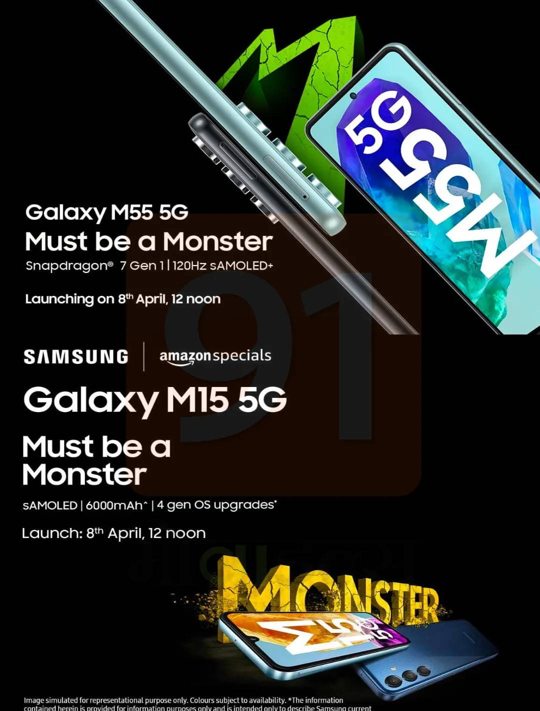8 এপ্রিল ভারতে Samsung Galaxy M15 5G এবং Galaxy M55 5G ফোনগুলি লঞ্চ করা হবে। কোম্পানির পক্ষ থেকে এই ফোনগুলির দাম ঘোষণার আগেই আমরা উপরোক্ত ফোনের দাম জানতে পেরেছি। রিটেল সোর্সের পক্ষ থেকে শেয়ার করা ডিটেইলসের মাধ্যমে Samsung Galaxy M15 5G এবং Galaxy M55 5G ফোনগুলির India Price প্রকাশ্যে এসেছে, নীচে এই সম্পর্কে বিস্তারিত আলোচনা করা হল।