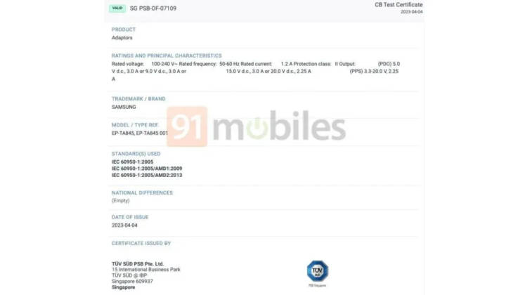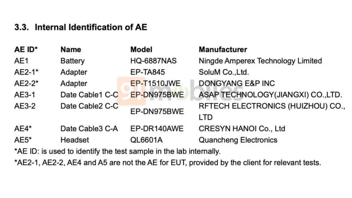 - TUV SUD লিস্টিং থেকে জানা গেছে এই ফোনের অ্যাডাপ্টারের মডেল নাম্বার EP-TA845 এবং EP-TA845 001।