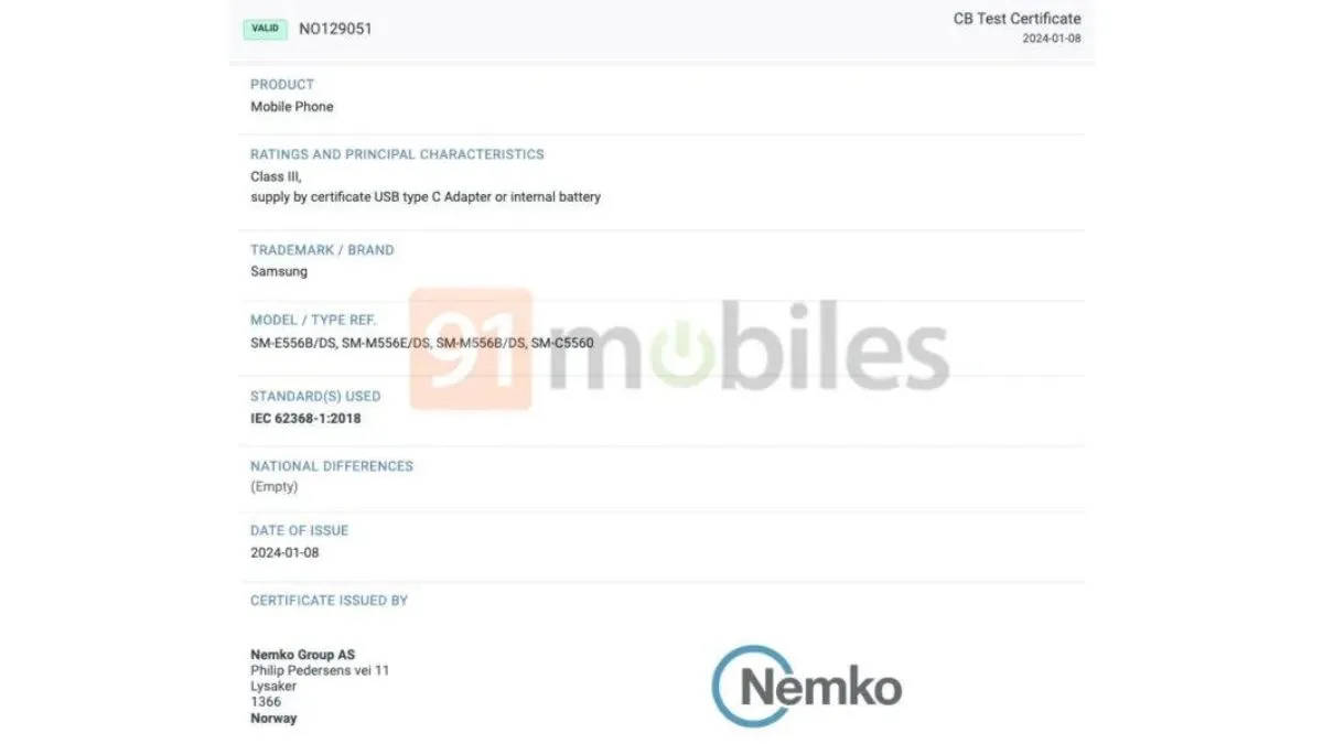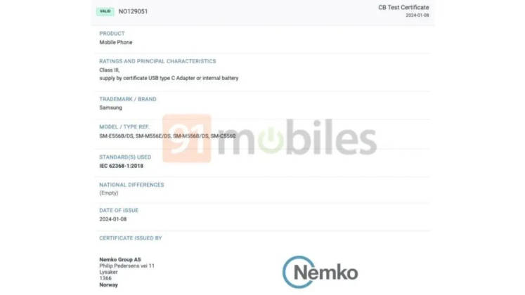 - এই ফোনটি Nemko সার্টিফিকেশন সাইটেও দেখা গেছে। এই লিস্টিং অনুযায়ী ফোনের কেবলের মডেল নাম্বার SM-M556E/DS হবে।