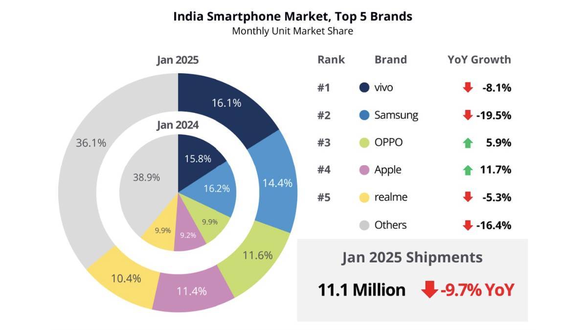 ভারতীয় স্মার্টফোন বাজারে 2025 সালের জানুয়ারি মাসে হ্রাস দেখা গেছে। বাজারের এই পরিস্থিতি ষত্বেও Apple এবং OPPO এই সময়ের মধ্যে বৃদ্ধি করেছে। বাজারে এক সময়ের উন্নতির পর এই মন্দা এসেছে। গত বছর অর্থাৎ 2024 সালে ভারতের স্মার্টফোন বাজারে বার্ষিক 4% বৃদ্ধি হতে দেখা গেছে। এই সময়ে দাঁড়িয়ে Vivo স্যামসাঙকে পেছনে ফেলে দেশের সবচেয়ে বড় স্মার্টফোন ব্র্যান্ডের মুকুট জিতে নিয়েছে।