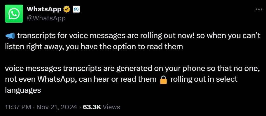 আগামী কয়েক সপ্তাহের মধ্যে এই ফিচার গ্লোবাল স্তরে রোলআউট করে দেওয়া হবে। যদি ইউজারদের সিলেক্ট করা ভাষা এবং ভয়েস ম্যাসেজের ভাষা এক না হয় সেক্ষেত্রে ট্রান্সক্রিপ্ট জেনারেট করতে দেরি বা ভুল হতে পারে। ভয়েস ম্যাসেজের রিড রিসিপ্ট রিসিভারের প্রাইভেসি সেটিংসের মতোই কাজ করবে।