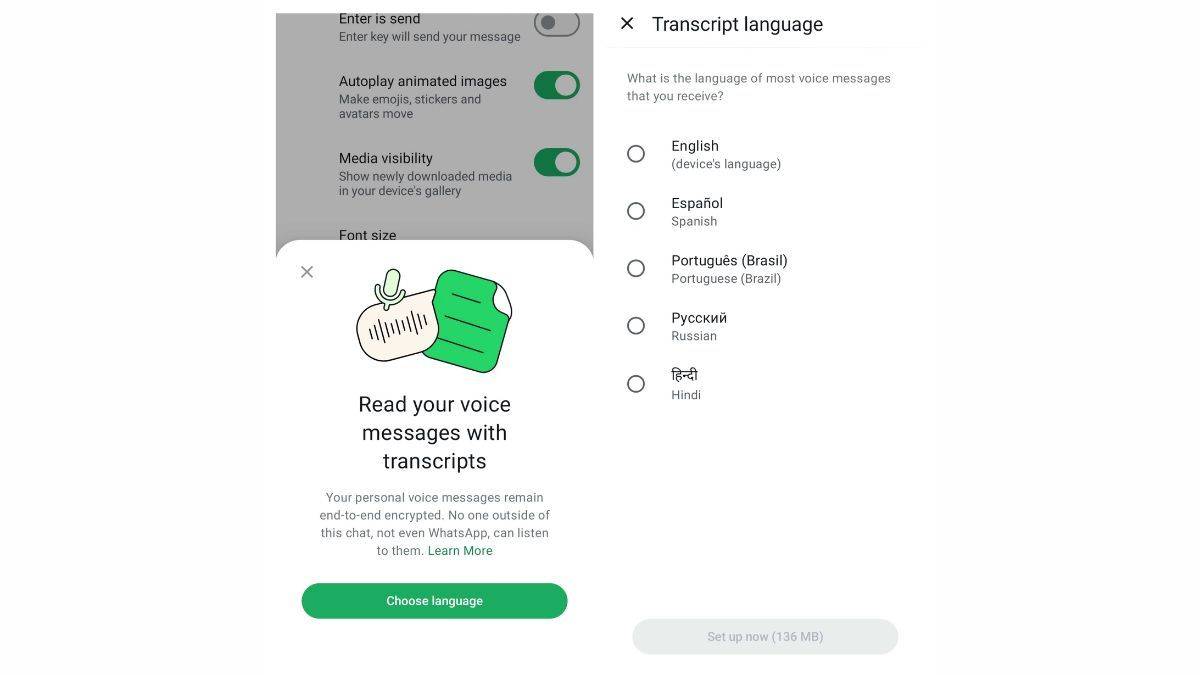 WhatsApp এর দেওয়া ডেটা অনুযায়ী আগামী কয়েক সপ্তাহের মধ্যে গোটা বিশ্বের সমস্ত iOS এবং Android ইউজারদের জন্য ভয়েস ম্যাসেজ ট্রান্সক্রিপশন ফিচার রোলআউট করে দেওয়া হবে। প্রথম পর্যায়ে এই ফিচার হাতে গোনা কয়েকটি ভাষা সাপোর্ট করবে। কোম্পানির পক্ষ থেকে জানানো হয়েছে শুরুতে এই ফিচারে ইংলিশ, পর্তুগিজ, স্প্যানিশ এবং রাশিয়ান ভাষা সাপোর্ট পাওয়া যাবে। তবে এই ফিচারের বিটা ভার্সনে ইতিমধ্যে হিন্দি ভয়েস ম্যাসেজও টেক্সটে কনভার্ট করার অপশন রয়েছে। ভবিষ্যতে বিভিন্ন ভাষা এতে সাপোর্ট করার পরিকল্পনা নেওয়া হচ্ছে।