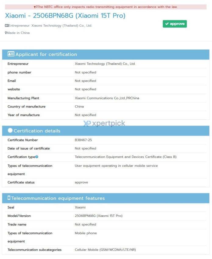 Xiaomi 15T Pro ফোনের NBTC লিস্টিং