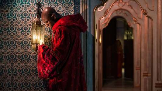 The demonic man who appears during Alithea's presentation, and who tried to control her luggage cart in the airport can both later be seen standing among the Queen of Sheba's courtiers.