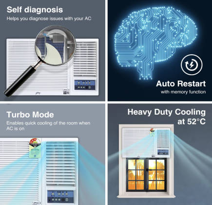 अमेजन पर Godrej ब्रांड का यह 1.5 टन का AC 4 स्टार के साथ सिर्फ 26,999 रुपये में सेल किया जा रहा है। इस AC के साथ कई बैंक ऑफर्स और नो कॉस्ट ईएमआई दी जा रही है। वहीं, इसकी कूलिंग पावर 4.95 Kilowatts है। इतना ही नहीं इसके स्पेशल फीचर की बात की जाए तो इसमें R32 ग्रीन एसी, एंटीकोर्सिव ब्लू फिन्स के साथ कॉपर कंडेनसर, हाइड्रोफिलिक ब्लू फिनि इवेपोरेटर, डस्ट फिल्टर R32 ग्रीन एसी, एंटीकोर्सिव ब्लू फिन्स के साथ कॉपर कंडेनसर, हाइड्रोफिलिक ब्लू फिनि इवेपोरेटर औऱ डस्ट फिल्टर है। इसके अलावा इस प्रोडक्ट का डाइमेंशन 66D x 66W x 43H सेंटीमीटर है।