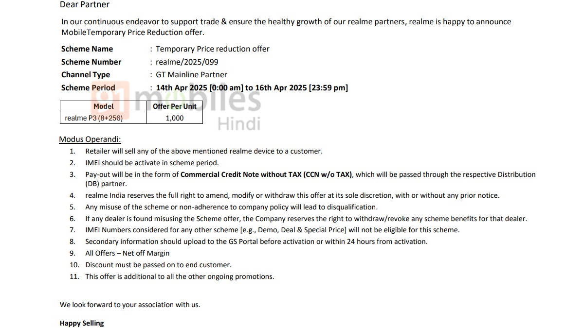 रियलमी ने अपने फैंस के लिए पी3 5जी मोबाइल पर 1 हजार रुपये का प्राइस कट किया है। यह कटौती सीमित समय के लिए है जो आज 14 अप्रैल से शुरू होकर 16 अप्रैल की तक चलेगी। इस दौरान 19,999 रुपये में लॉन्च हुए 8जीबी + 256जीबी वेरिएंट को 18,999 रुपये में खरीदा जा सकता है।