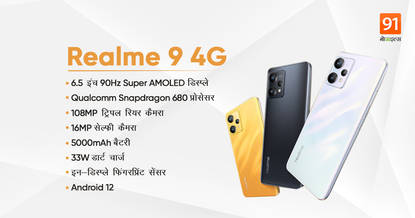 Realme ने भारत में अपनी नंबर सीरीज़ का लेटेस्ट स्मार्टफ़ोन Realme 9 4G को लॉन्च कर दिया है। रियलमी 9 4जी स्मार्टफ़ोन कंपनी का कैमरा सेंट्रिक स्मार्टफ़ोन है। Realme 9 4G स्मार्टफ़ोन की सबसे ख़ास बात यह है कि इस फोन का प्राइमरी कैमरा है। इस फ़ोन में सैमसंग का 108MP HM6 कैमरा सेंसर दिया गया है। इसके साथ ही रियलमी के इस फ़ोन को क्वालकॉम के Snapdragon 680 प्रोसेसर के साथ पेश किया गया है। Realme 9 4G स्मार्टफ़ोन में इन-डिस्प्ले फ़िंगरप्रिंट स्कैनर दिया गया है। यहां हम आपको रियलमी के लेटेस्ट Realme 9 4G स्मार्टफ़ोन के स्पेसिफिकेशन्स, फ़ीचर्स, क़ीमत और सेल ऑफर्स के बारे में बता रहे हैं।