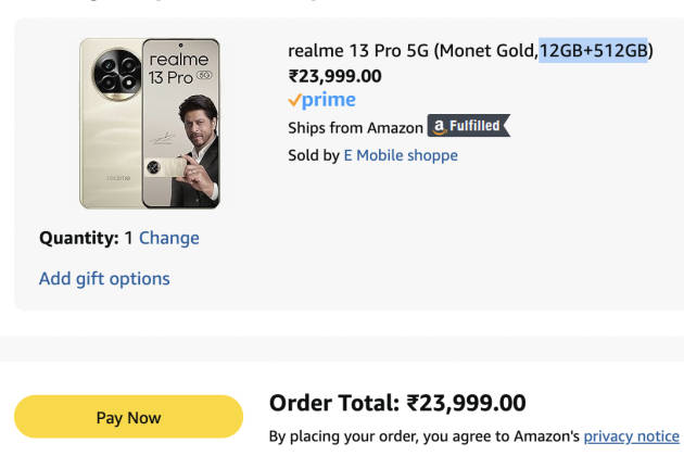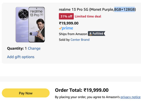 सबसे पहले बेस वेरिएंट की बात करें तो रियलमी 13 प्रो का 8जीबी रैम वाला मॉडल 128जीबी स्टोरेज के साथ 26,999 रुपये में लॉन्च हुआ था। इसे अब शॉपिंग साइट अमेजन 19,999 रुपये में बेचा रहा है। इसी तरह realme 13 Pro का 12जीबी रैम व 512जीबी स्टोरेज वेरिएंट 31,999 रुपये में लाया गया था जो अब 23,999 रुपये में सेल के लिए उपलब्ध है। ये दोनों वेरिएंट लॉन्च प्राइस से क्रमश: 7,000 रुपये और 8,000 रुपये सस्ते रेट पर खरीदे जा सकते हैं। यह मोबाइल के Monet Purple कलर मॉडल की कीमत है।