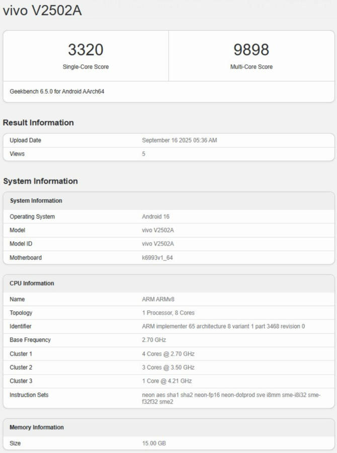 iQOO Neo 11 Pro गीकबेंच पर vivo V2520A मॉडल नंबर के साथ लिस्ट हो गया है। यह गीकबेंच लिस्टिंग आज यानी 16 सितंबर की ही है जहां एंड्रॉयड ओएस, प्रोसेसर और रैम डिटेल सामने आई है। सबसे पहले बेंचमार्क स्कोर की ही बात करें तो इस मोबाइल को सिंगल-कोर में 3320 प्वाइंट्स और मल्टी-कोर में 9898 प्वाइंट्स प्राप्त हुए हैं। लिस्टिंग के मुताबिक यह अपकमिंग आइकू मोबाइल सबसे नए और लेटेस्ट Android 16 ऑपरेटिंग सिस्टम के साथ मार्केट में उतारा जाएगा।