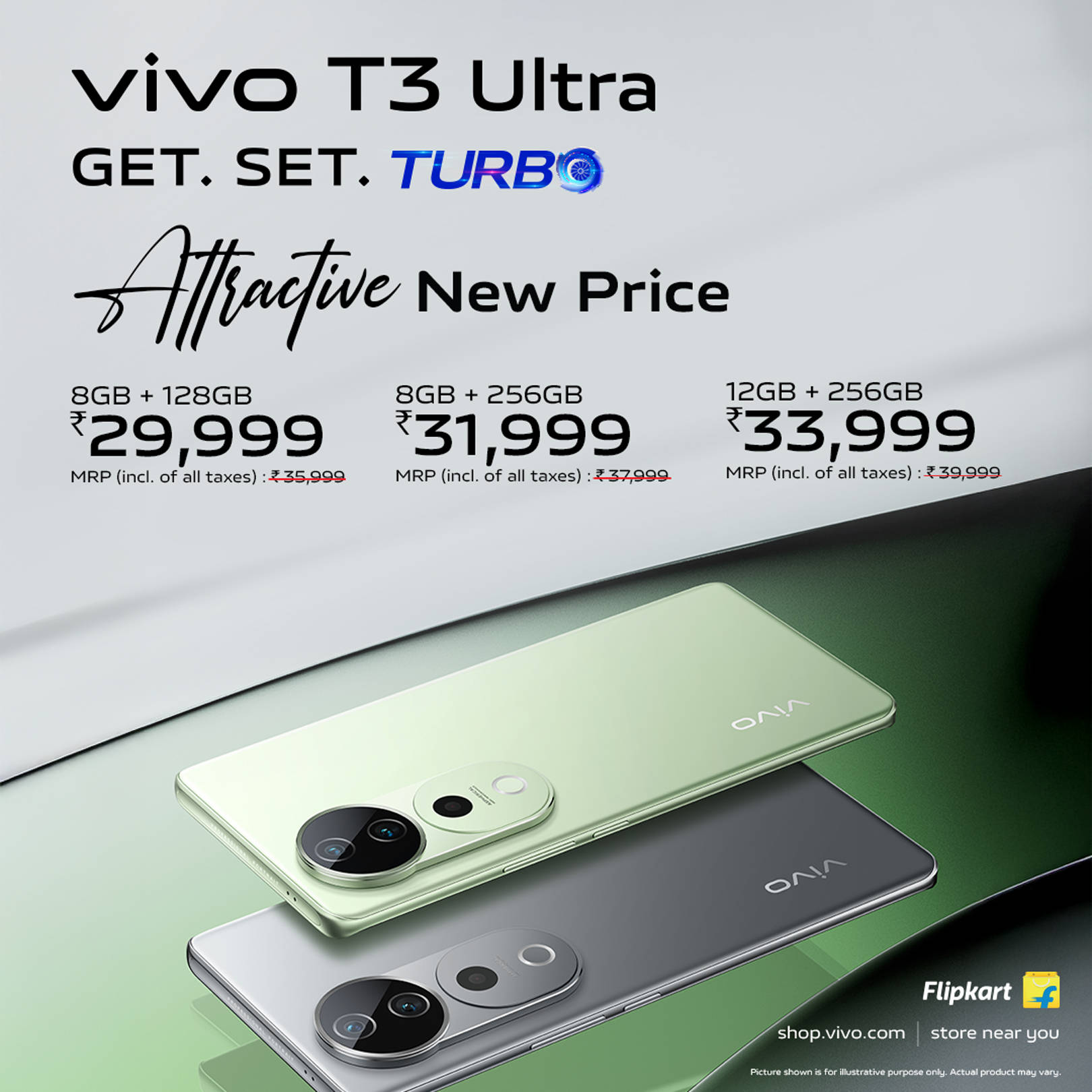वीवो टी3 प्रो के दो वेरिएंट्स के साथ ही टी3 अल्ट्रा 5जी फोन के तीन वेरिएंट्स पर भी प्राइस ड्रॉप हुआ है। फोन के तीनों वेरिएंट्स का रेट 2000 रुपये घटा दिया गया है जिसके बाद 8जीबी+128जीबी 29,999 रुपये में, 8जीबी+256जीबी 31,999 रुपये में और 12जीबी+256जीबी 33,999 रुपये में खरीदा जा सकता है। यह मोबाइल Forest Green और Lunar Grey कलर में बिक रहा है।