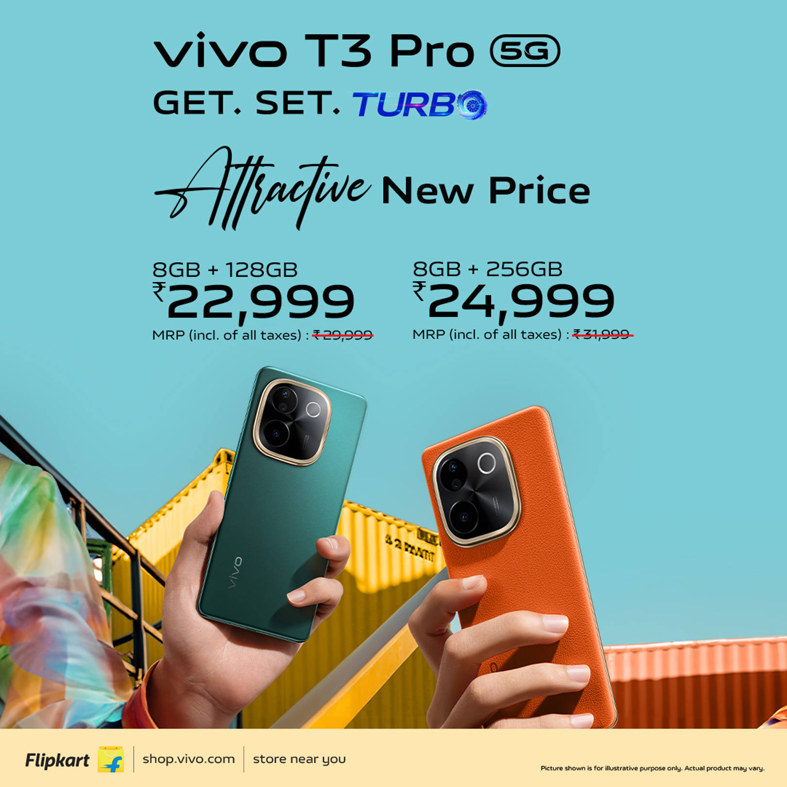 वीवो टी3 प्रो 5जी फोन के दोनो वेरिएंट्स की कीमत 2 हजार रुपये कम हो गई है। इस प्राइस ड्रॉप के बाद 8जीबी+128जीबी को 22,999 रुपये में तथा 8जीबी+256जीबी को 24,999 रुपये में खरीदा जा सकता है। यह फोन Sandstone Orange और Emerald Green कलर में सेल के लिए उपलब्ध है।
