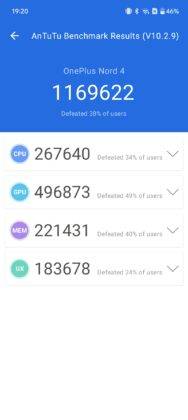 एनटूटू बेंचमार्क में वनप्लस नोर्ड 4 स्मार्टफोन 4,99,000 से भी ज्यादा प्वाइंट्स से वीवो वी40ई को हराता है। सिर्फ इतना ही नहीं सीपीयू, जीपीयू, मेमोरी और यूएक्स के एनटूटू स्कोर भी वनप्लस मोबाइल के ज्यादा तथा वीवो स्मार्टफोन के कम आए हैं।