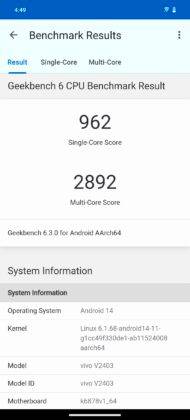 गीकबेंच सिंगल-कोर टेस्ट में Vivo V40e ने 962 स्कोर हासिल किया तथा वनप्लस नॉर्ड 4 का सिंगल-कोर गीकबेंच स्कोर 1744 आया। इसी तरह वीवो वी40ई का मल्टी-कोर गीकबेंच स्कोर 2892 रहा जबकि OnePlus Nord 4 ने मल्टी-कोर गीकबेंच बेंचमार्क टेस्ट में 4365 स्कोर अचीव किया है।