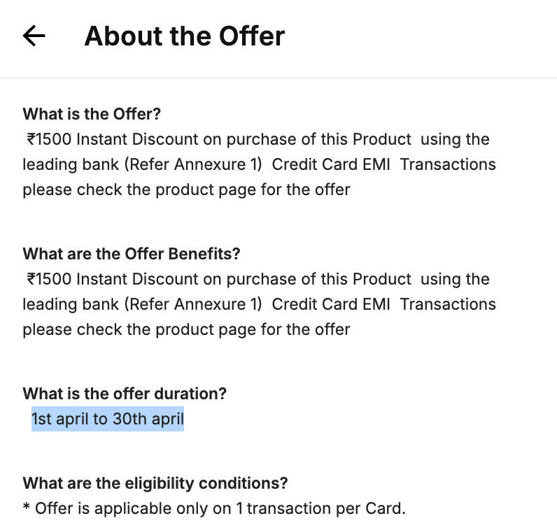 - HDFC, SBI और Axis बैंक के क्रेडिट कार्ड से ईएमआई बनवाने पर 1,500 रुपये का एक्स्ट्रा डिस्काउंट मिलेगा।