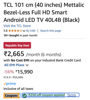 - इस डिस्काउंट कूपन के बाद टीवी का प्राइस 15,740 रुपये (₹15990-₹250) पड़ेगा।