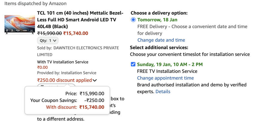 - TCL का 40L4B मॉडल नंबर वाला 40-इंच टीवी शॉपिंग साइट अमेजन पर 15,990 रुपये में सेल के लिए लिस्ट है।