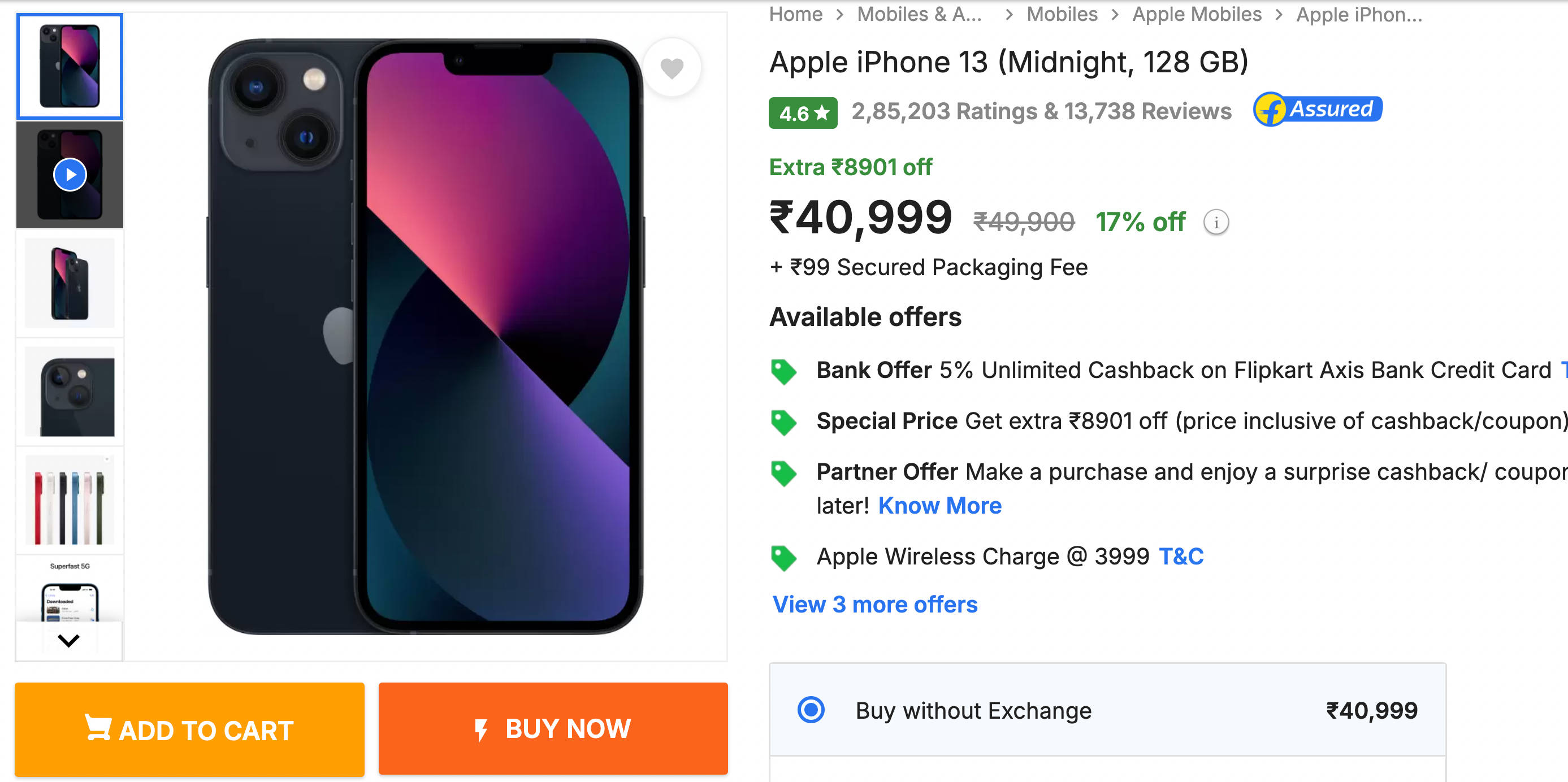 iPhone 13 फ्लिपकार्ट पर 40,999 में मिल रहा है। यह फोन का सेलिंग प्राइस है जिसके लिए किसी बैंक कार्ड की जरूरत नहीं है। वहीं अगर Flipkart Axis Bank Credit Card से पेमेंट की जाती है तो 5% का एक्स्ट्रा कैशबैक भी मिलेगा। यह कैशबैक तकरीबन 2,049 रुपये का होगा। इस क्रेडिट कार्ड से फोन का इफेक्टिव प्राइस 38,950 रुपये (₹40,999 – ₹2,049) होगा।