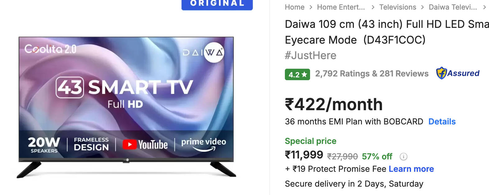 • Daiwa (43 inch) Full HD LED Smart Linux TV 2024 Edition शॉपिंग साइट फ्लिपकार्ट पर सस्ते रेट में बिक रहा है।