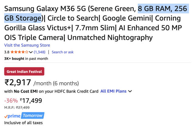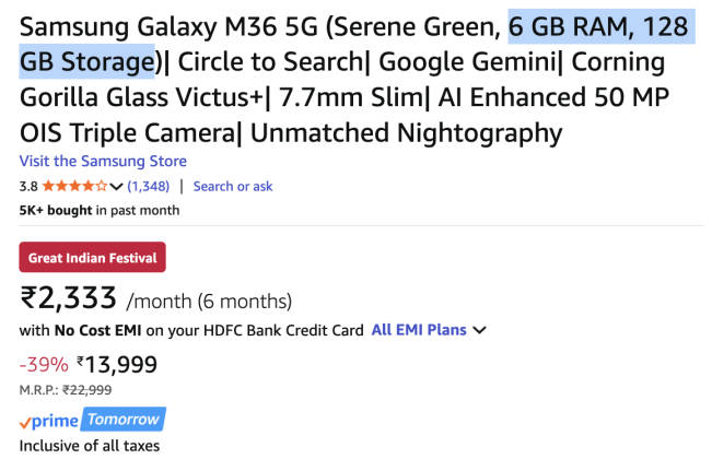 सैमसंग गैलेक्सी एम36 5जी फोन इंडिया में 6जीबी रैम और 8जीबी रैम पर लॉन्च हुआ था जिनकी कीमत आप ऊपर लगी टेबल में देख सकते हैं। कंपनी की ओर से 128जीबी स्टोरेज वेरिएंट पर 3500 रुपये का डिस्काउंट दिया जा रहा है जिसके साथ यह सैमसंग 5जी फोन सिर्फ 13,999 रुपये की शुरुआती कीमत पर खरीदा जा सकता है।