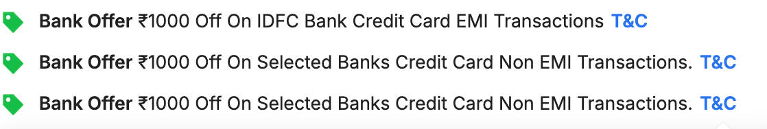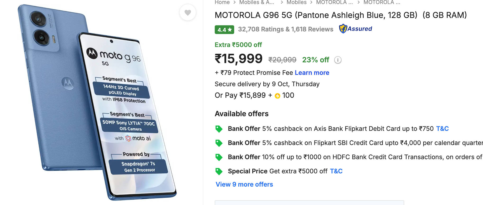 इस भारी छूट के अलावा भी मोटोरोला जी95 5जी फोन पर 1,000 रुपये का बैंक ऑफर दिया जा रहा है। SBI, Kotak, Fedral, IDFC, IDBI और HDFC Bank Credit Card से पेमेंट करने वाले ग्राहकों को 1 हजार रुपये का एक्स्ट्रा डिस्काउंट मिलेगा जिसके बाद यह मोबाइल सिर्फ 14,999 रुपये में खरीदा जा सकेगा।