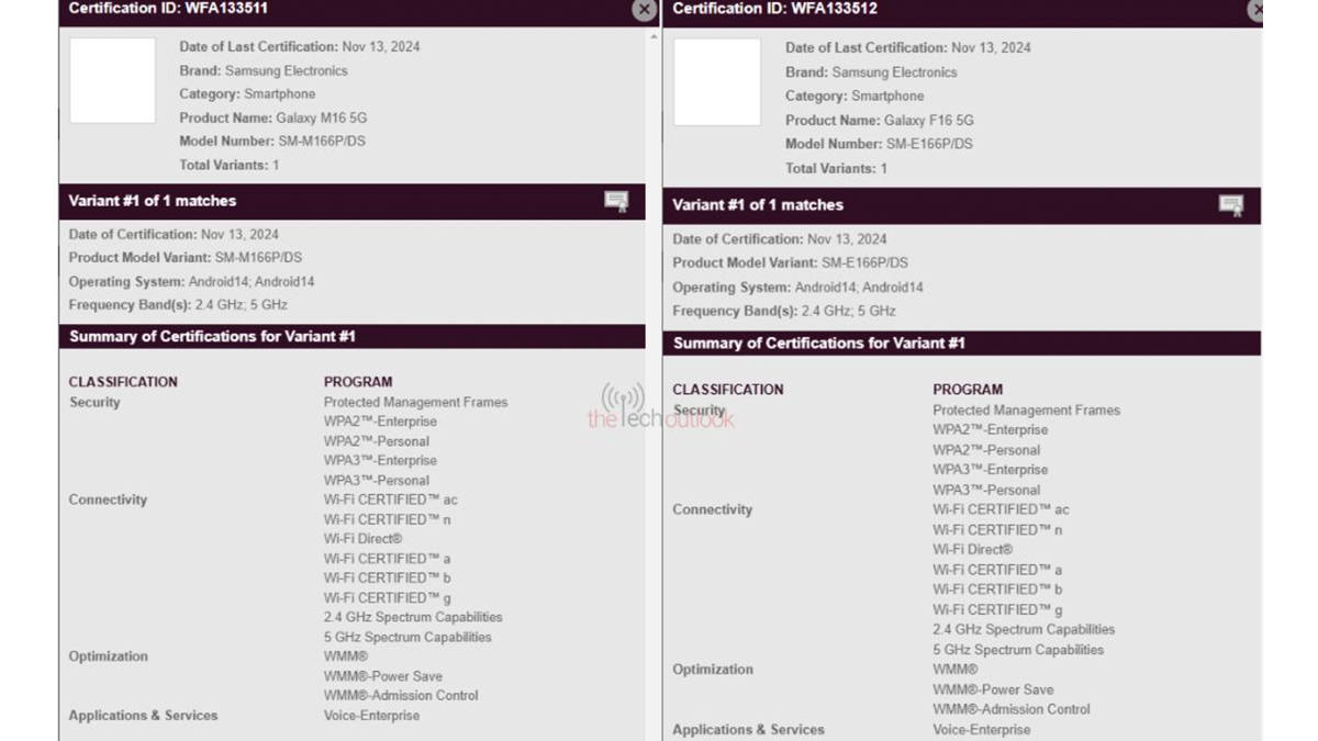 सैमसंग गैलेक्सी एम16 5जी और गैलेक्सी एफ16 5जी फोन को Wi-Fi Alliance पर सर्टिफाइड किया गया है। इस सर्टिफिकेशन साइट पर एम16 जहां ‘SM-M166P/DS’ मॉडल नंबर के साथ लिस्ट हुआ है वहीं एफ16 5जी फोन ‘SM-E166P/DS’ मॉडल नंबर के साथ सामने आया है। यहां मोबाइल्स की स्पेसिफिकेशन्स तो सामने नहीं आई है लेकिन यह जरूर साफ हो गया है कि दोनों फोन 2.4GHz और 5GHz dual band Wi-Fi सपोर्ट करेंगे। साथ ही इन सैमसंग स्मार्टफोंस में Wi-Fi Direct, dual SIM और Android 14 OS दिए जाने की बात भी लिस्टिंग में सामने आई है।