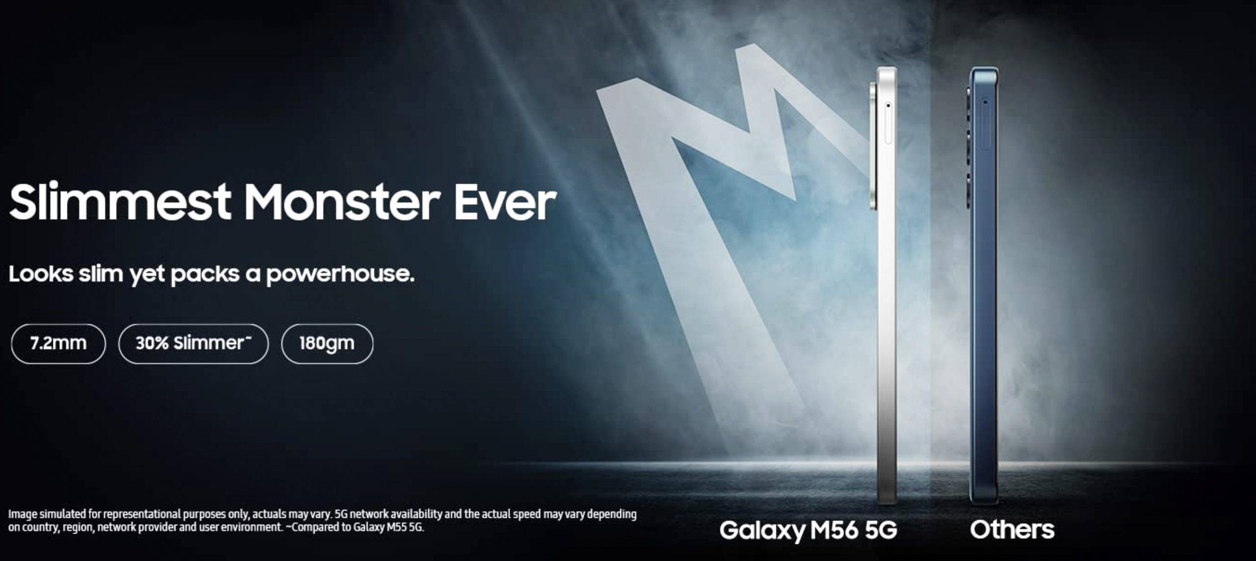 Presenting the Slimmest phone in the segment – the all-new #GalaxyM56 5G. Effortless to hold, and with remarkable power. 7.2mm sleek and 180gm light, this is the #MonsterestMonster. #Samsung pic.twitter.com/XaATiQhzrn