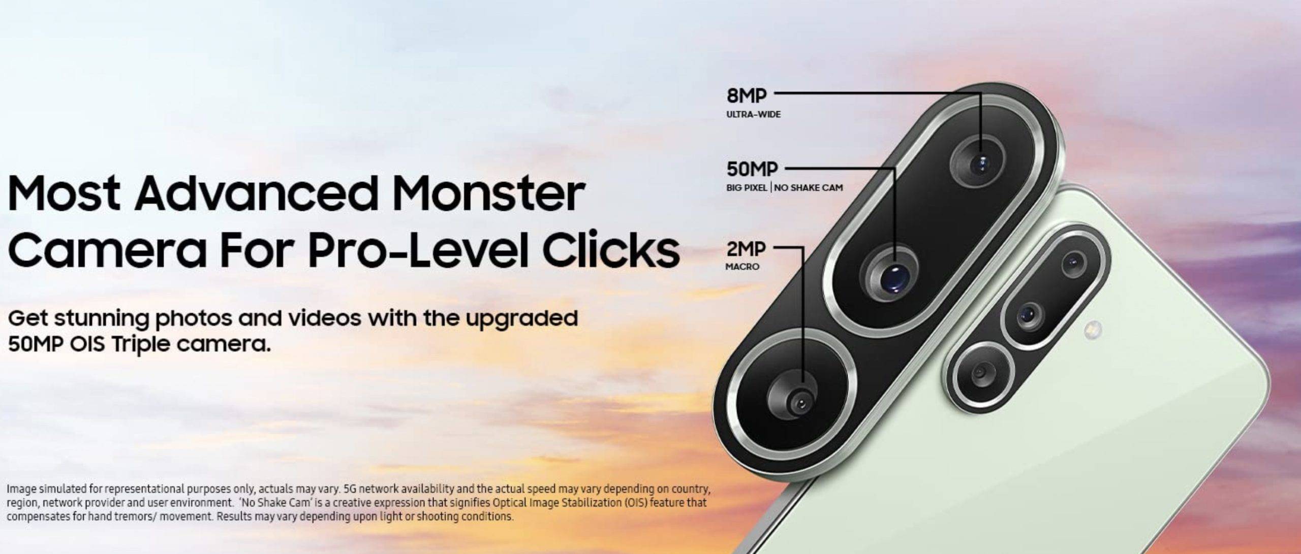 सैमसंग ने खुलासा कर दिया है कि गैलेक्सी एम56 5जी फोन ट्रिपल रियर कैमरा सपोर्ट करता है। इसके बैक पैनल पर एलइडी फ्लैश से लैस 50 मेगापिक्सल का OIS सेंसर दिया गया है जिसके साथ 8 मेगापिक्सल ultra-wide एंगल लेंस और 2 मेगापिक्सल macro सेंसर शामिल है।