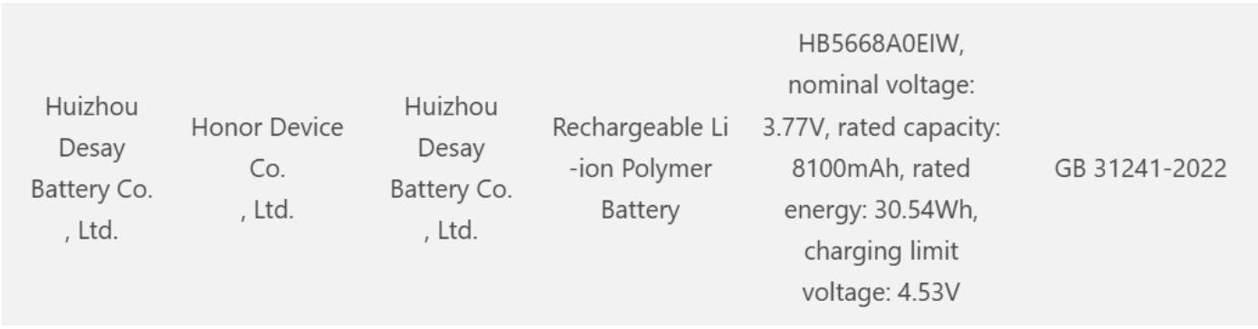 सबसे पहले 3सी डाटबेस की बात करे तो यहां HB5668A0EIW मॉडल नंबर वाली बैटरी को लिस्ट किया गया है जिसकी रेटेड कैपेसिटी 8,100एमएएच बताई गई है। इस बैटरी का मैन्युफेक्चरर ऑनर है। सर्टिफिकेशन के अनुसार यह Li-ion polymer battery है। इसकी रेटेड एनर्जी 30.54Wh, नॉमिनल वोल्टेज 3.77V और मैक्सिमम चार्जिंग वोल्टेज 4.53V बताई गई है। यहां मोबाइल का नाम तो सामने नहीं आया है लेकिन डिजिटल चैट स्टेशन के अनुसार यह ब्रांड का नेक्स्ट Honor Power स्मार्टफोन होगा।