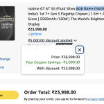 रियलमी जीटी 6टी 5जी फोन का 8जीबी रैम के साथ 256जीबी स्टोरेज सपोर्ट करने वाली मॉडल कंपनी की ओर से 32,999 रुपये में लॉन्च किया गया था। ब्रांड की ओर से इस वेरिएंट की कीमत पहले 4 हजार रुपये कम की गई और अब इसपर 5 हजार रुपये का कूपन डिस्काउंट दिया जा रहा है। इस तरह से realme GT 6T अपने लॉन्च प्राइस से 9 हजार रुपये सस्ते रेट में खरीदा जा सकता है। 5,000 रुपये डिस्काउंट ऑफर की बात करें तो यह कूपन डिस्काउंट है जो शॉपिंग साइट अमेजन द्वारा दिया जा रहा है।