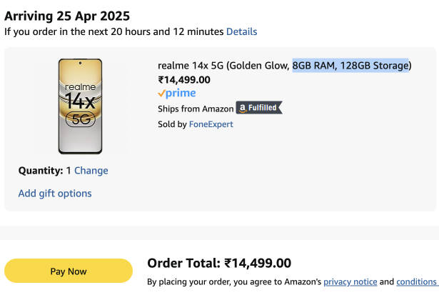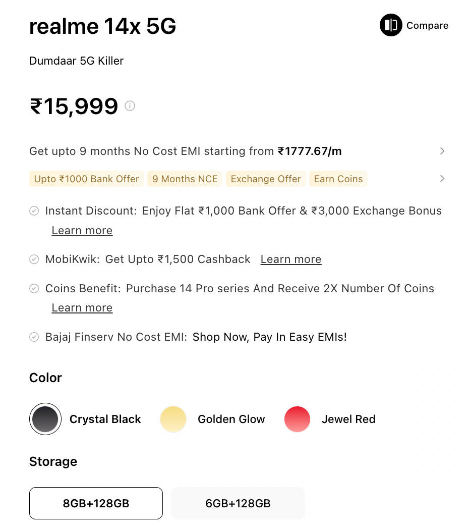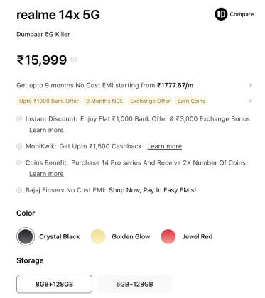 - वहीं कंपनी की आधिकारिक वेबसाइट रियलमी इंडिया पर भी realme 14x 8GB मॉडल 15,999 रुपये में बेचा जा रहा है।