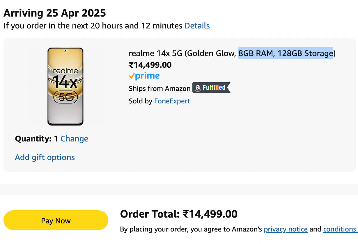 इस वक्त सिर्फ अमेजन पर ही यह 8जीबी रैम वाला 5जी फोन 15 हजार रुपये से सस्ता बिक रहा है जिसे केवल 14,499 रुपये में खरीदा जा सकता है। realme 14x पर मिल रहे ऑफर की डिटेल्स जानने या फिर इस सस्ते 5जी फोन को परचेज करने के लिए (यहां क्लिक करें)।