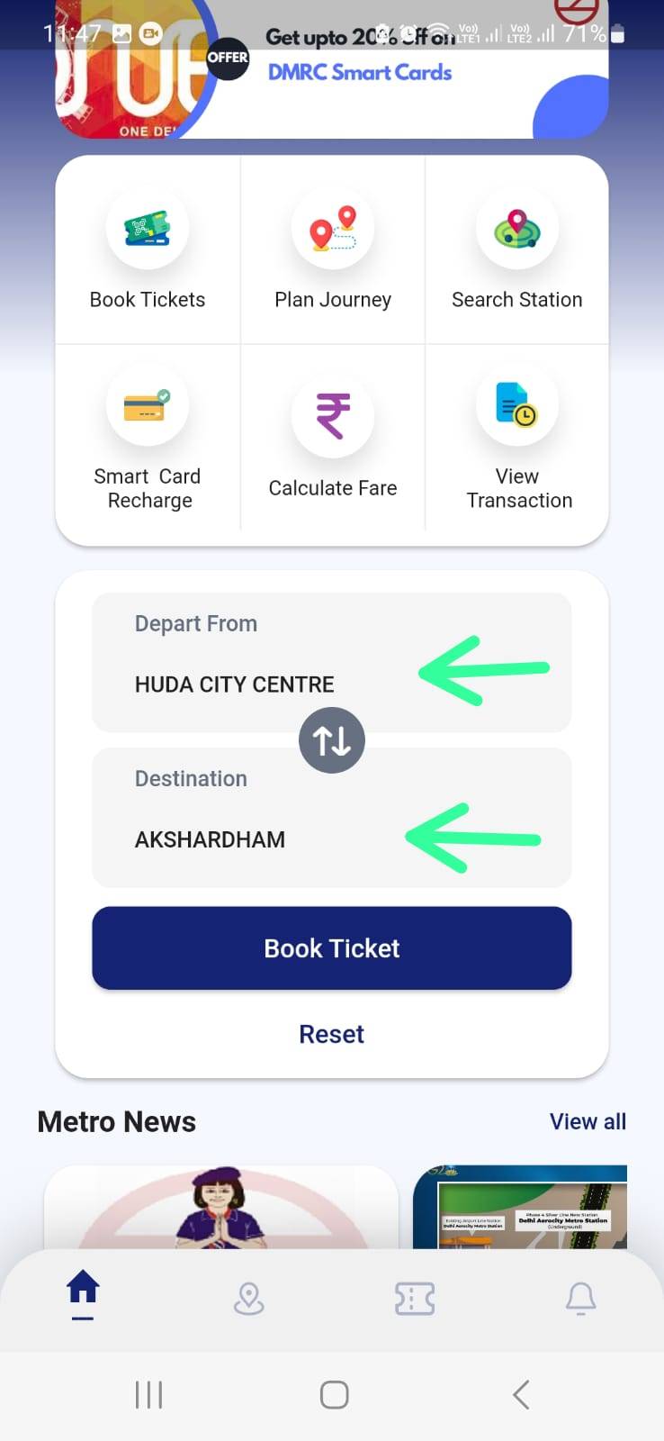 - अकाउंट क्रिएट करने के बाद ऐप में BOOK Ticket पर क्लिक करने के बाद यात्रा शुरू करने और खत्म करने के स्टेशन सलेक्ट करें।
