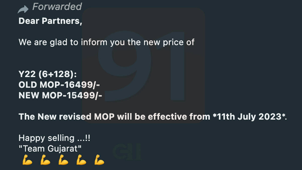 वीवो वाई22 स्मार्टफोन का 6GB RAM + 12GB Storage वेरिएंट कंपनी की ओर से 16,499 रुपये की कीमत पर लॉन्च किया गया था। अब इस मॉडल पर 1,000 रुपये का प्राइस कट जारी कर दिया गया है जिसके बाद 6जीबी+128जीबी वेरिएंट का दाम घटकर 15,499 रुपये हो गया है। यह नई कीमत आज 11 जुलाई से ही लागू हो गई है तथा Vivo Y22 को नए रेट में ऑनलाइन व ऑफलाइन मार्केट से खरीदा जा सकता है।
