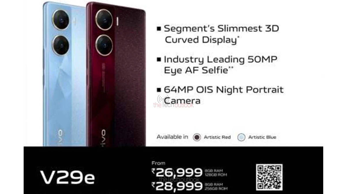 द टेक आउटलुक ने अपनी रिपोर्ट में फोन का लीक पोस्टर शेयर किया है जिसमें मैमोरी वेरिएंट्स और उनकी कीमत की जानकारी लिखी है। लीक के मुताबिक वीवो वी29ई 5जी फोन के 8जीबी रैम + 128जीबी स्टोरेज वेरिएंट की कीमत 26,999 रुपये होगी तथा मोबाइल के 8जीबी रैम + 256जीबी स्टोरेज वेरिएंट को 28,999 रुपये की कीमत पर बाजार में उतारा जाएगा। लीक की मानें तो यह फोन Artistic Black और Artistic Blue और कलर में बिकेगा।