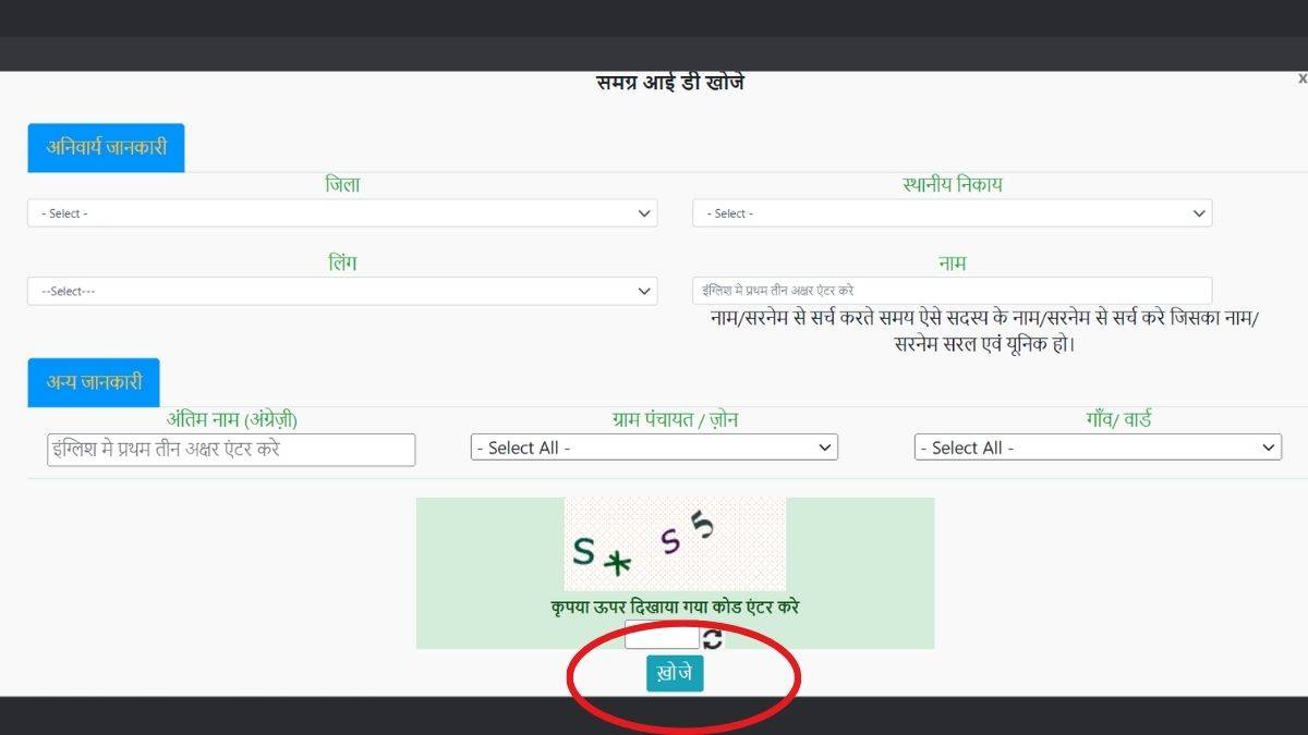 स्टेप-5: सभी जरूरी जानकारी दर्ज करने के बाद कैप्चा दर्ज करने के बाद नीचे ‘खोजें’ वाले बटन पर क्लिक कर आप Samagra ID By Name जान सकते हैं।