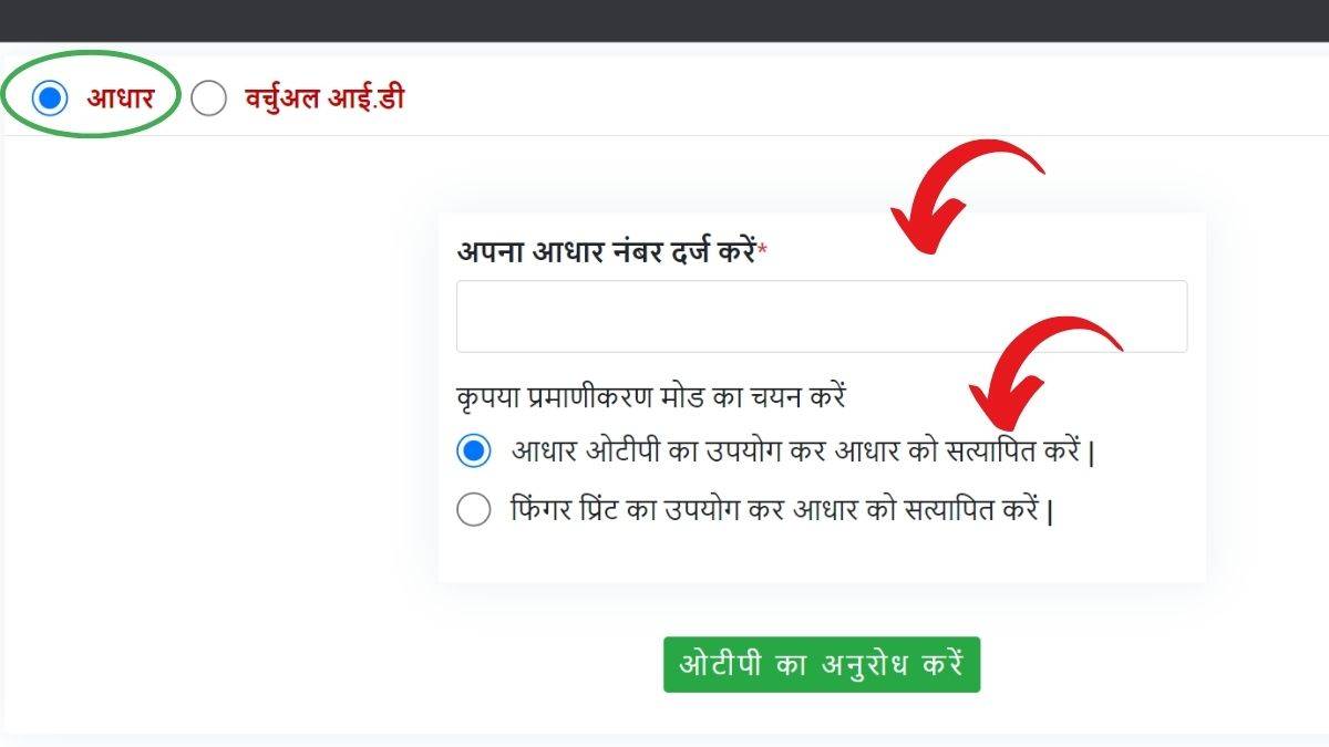स्टेप-4: ओटीपी दर्ज करने के बाद आपको आधार कार्ड या वर्चुअल आईडी कार्ड दर्ज करने के लिए कहा जाएगा। फिर आपको आधार ओटीपी का उपयोग कर आधार को सत्यापित करें या फिर फिंगर प्रिंट का उपयोग कर आधार को सत्यापित करें, इन दोनों विकल्प में से एक को चुन सकते हैं।