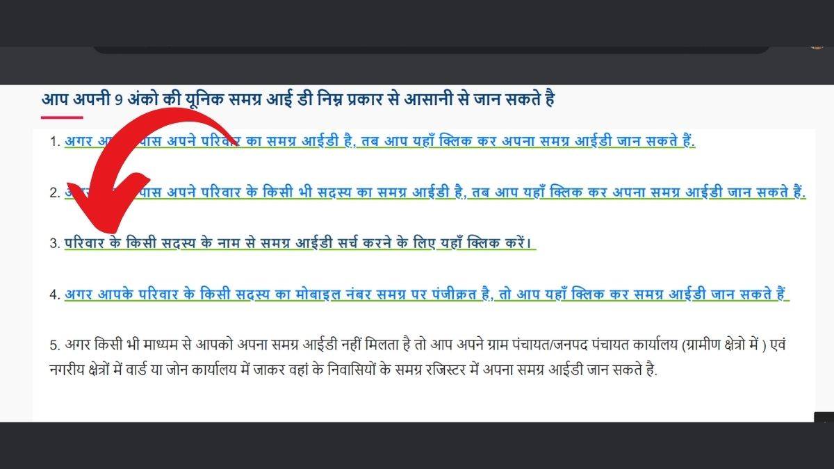स्टेप-3: अब आपको स्क्रॉल करते हुए नीचे की तरफ जाना है, जहां आपको ‘परिवार के किसी सदस्य के नाम से समग्र आईडी सर्च करने के लिए यहां क्लिक करें’ वाले लिंक पर क्लिक करें।