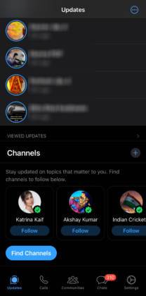 - Updates टैब में सबसे पहले Status मेन्यू दिया गया होगा तथा उसे नीचे अंत तक स्क्रॉल करने के बाद लॉस्ट में Channels का ऑप्शन मिलेगा। यहां ‘चैनल्स’ के साथ ही ‘+’ का चिन्ह होगा। इसपर क्लिक करें।
