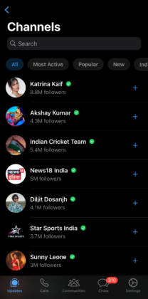 - यहां फेमस WhatsApp Channels की लिस्ट आएगी, अपनी पंसद के चैनल को चुन लें। लिस्ट में निम्नलिखित कैटेगरी शामिल होंगी: